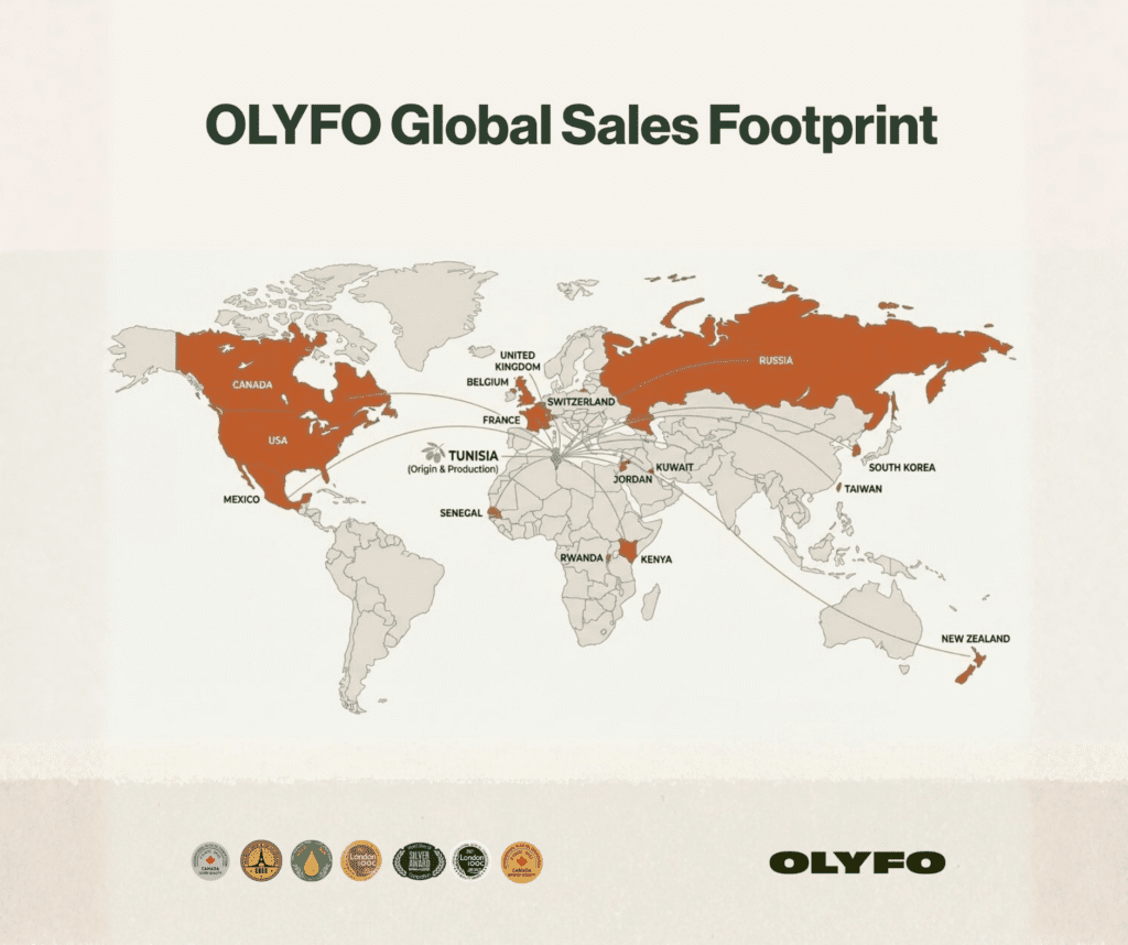توفر اوليفو زيت الزيتون البكر الممتاز التونسي الى اسواق متعددة حول العالم مستفيدة من مكانة تونس كثاني اكبر مصدر لزيت الزيتون عالميا وتشمل هذه الحضور مراكز اوروبية راسخة وفرص ناشئة في اسيا ونمو في افريقيا وطلب متزايد في امريكا مدعوم بعلامات تجارية حائزة على جوائز مثل الفين وخمسمئة عام من التقاليد والاتيكا وافريقيا
